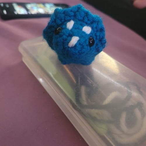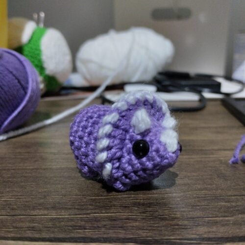 Add eyes into Rnd 3, sts 6 and 11. They should line up with the corner spikes of the frill.