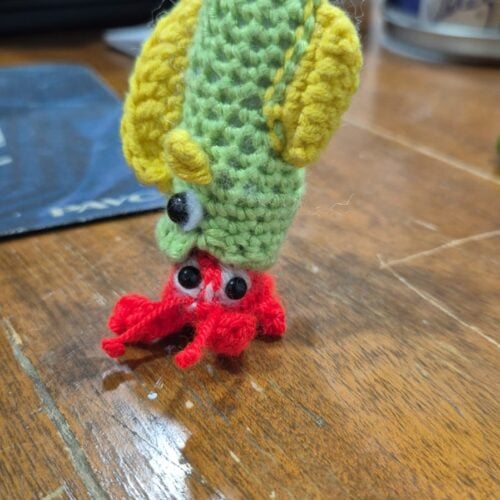 Left claw [ch 3, mp, ch 2, skip 1 working into ch and mp back sc2tog, working into chs sc 1,