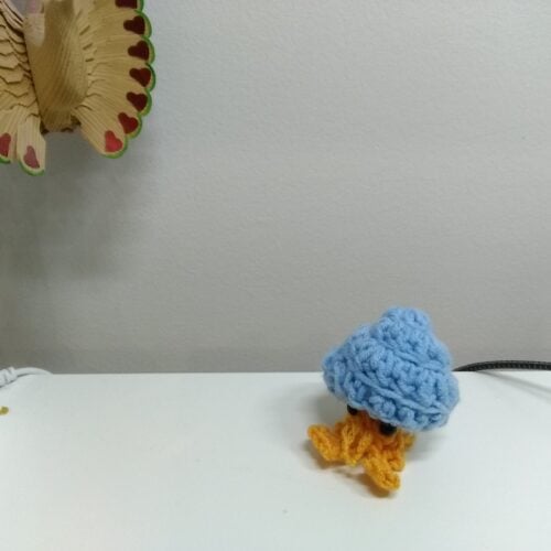 Cut the yarn and hide the end once your stitch count gets to 9 stitches, stuff slightly, before stuffing the hermit crab into the base! If your hole is too big, try slst in the BLO for the last round tightly to create a tighter fit.