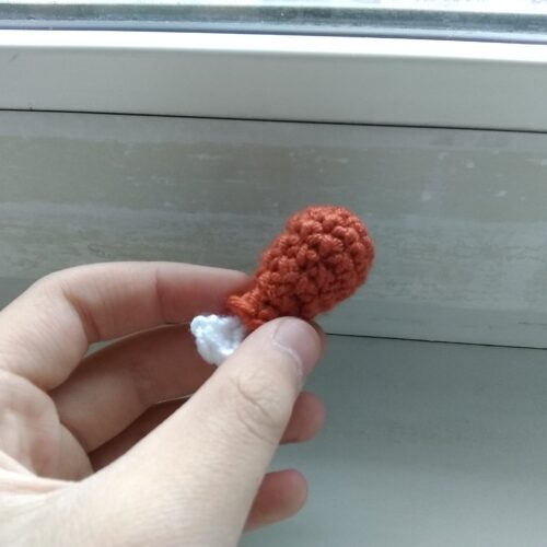 Stuff the Meat slightly, and sew on the Bone by sewing the two tails into opposing back loop stitches from Rnd 7 of the Meat.
