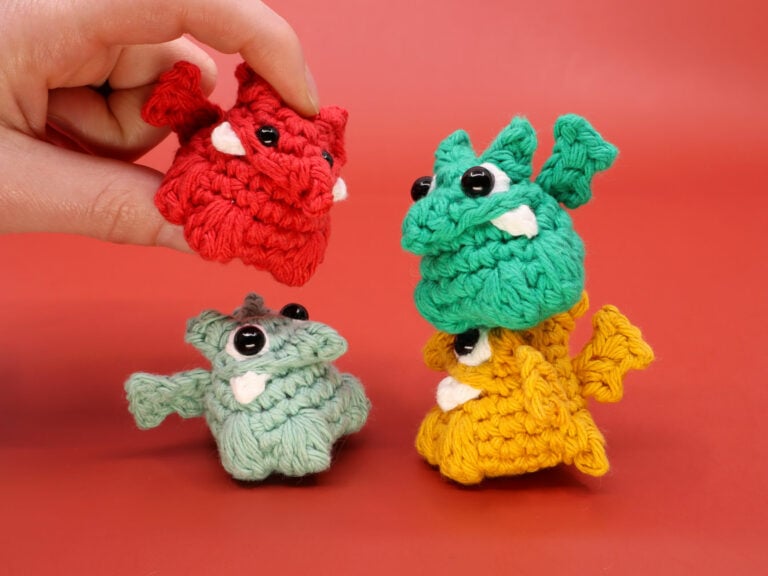 This pattern teaches how to make a miniature baby dragon. This pattern is designed around my Bawnimals, aka small spherical animals that you just can’t help but bawww at! This pattern is designed with as little sewing as possible, but can be a pretty difficult to master due to some specialized stitches like the Spiked Bobble Stitch used for the horns, nose, and tail. I suggest trying out the mini frog pattern first to get a general idea of the techniques used in this pattern.