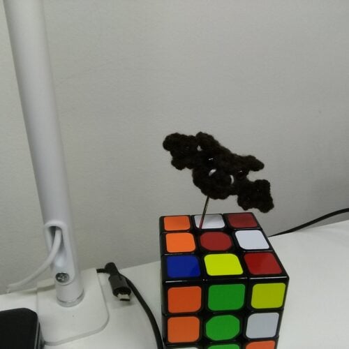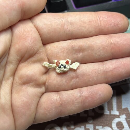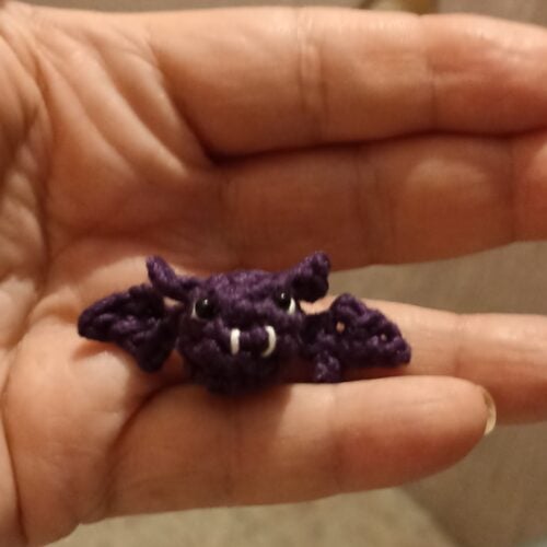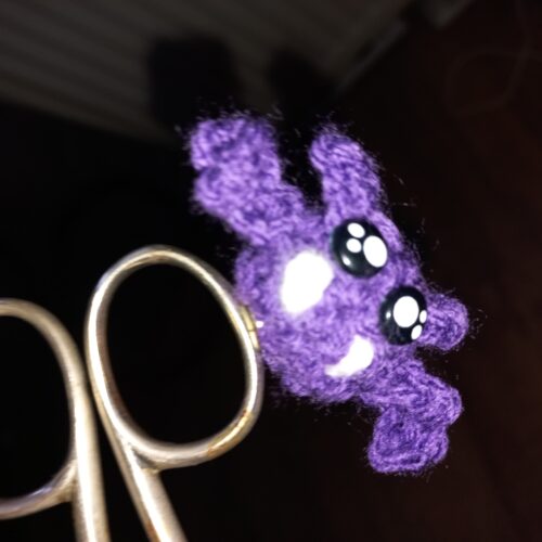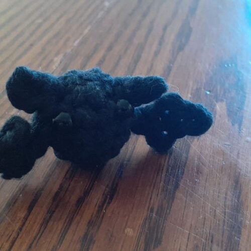 Add the eyes in Rnd 2 in the center of sts 5 and 8. Embroider on fangs using white.