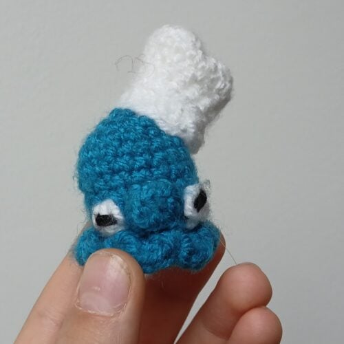 Your octopus' face as a whole can go anywhere between Rnds 5 – 8, but be sure it begins 2 stitches after the first invdec in Rnd 7 so that the face lines up perfectly centered.