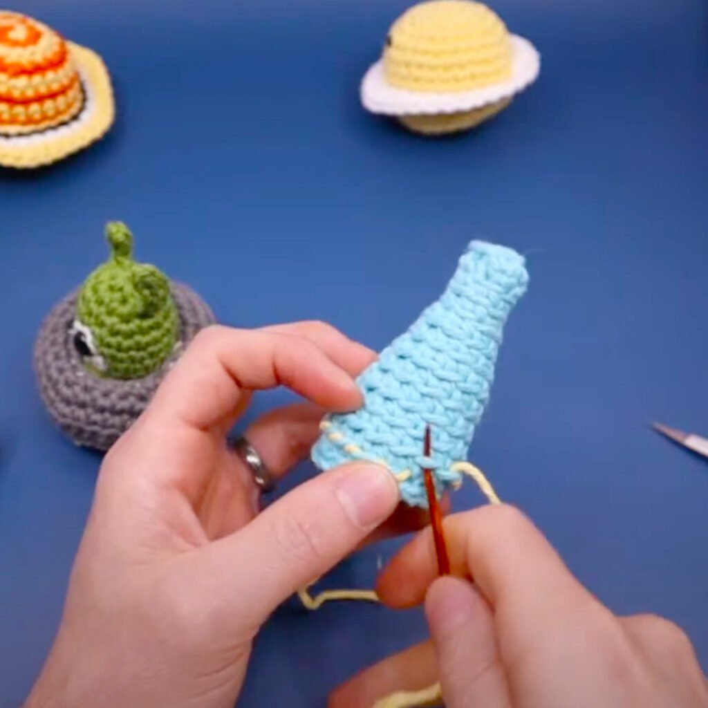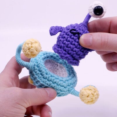 You can invert the top half of the UFO to create a space for your alien to snuggly fit into by pushing in and creating a little bowl. If you use the same type of yarn and hook as the UFO, it should be a perfectly snug fit.